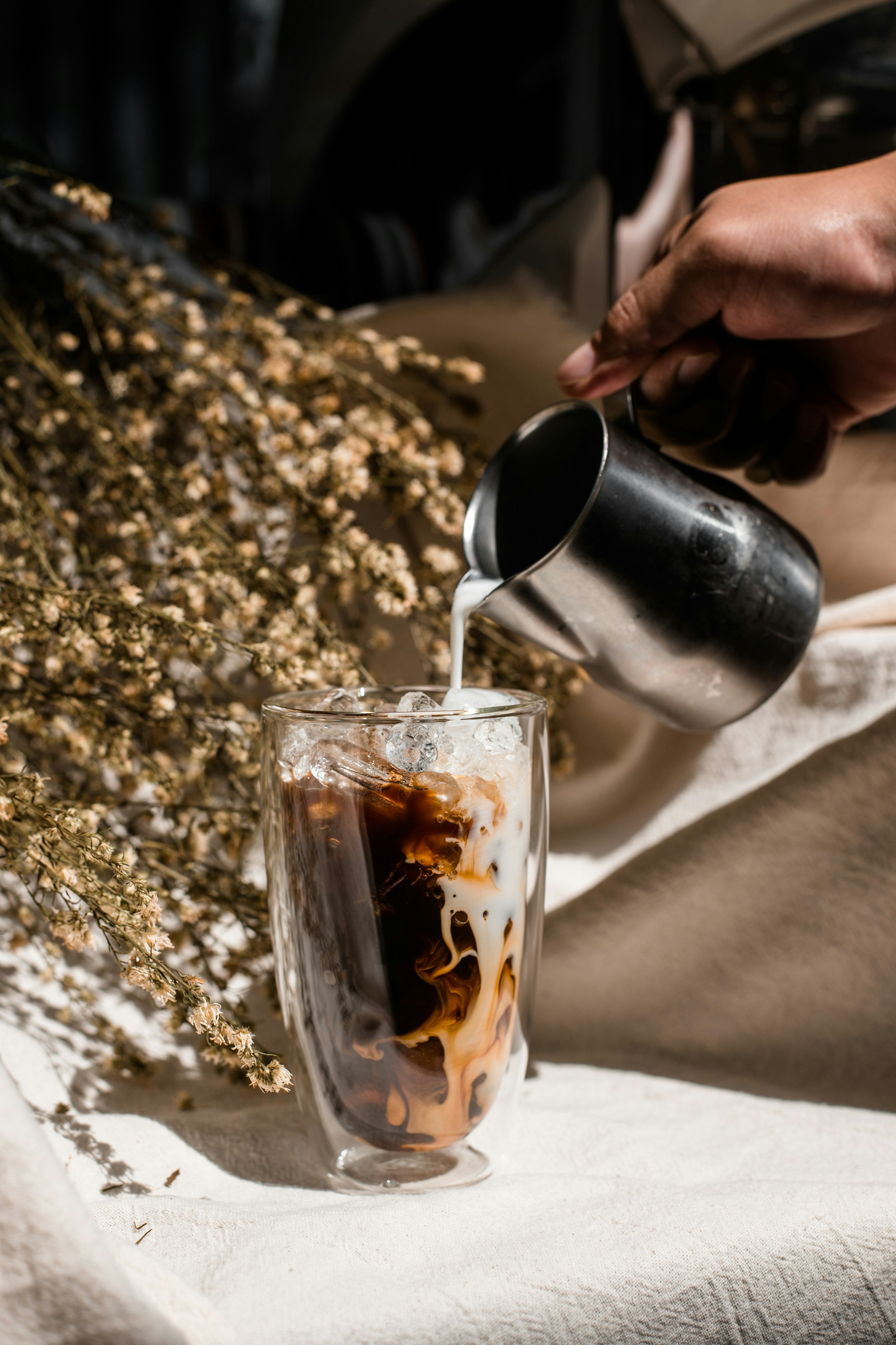 Füge die kalte Milch hinzu und rühre gut um. Du kannst auch etwas kaltes Wasser hinzufügen, wenn du eine weniger kräftige Kaffeenote bevorzugst.