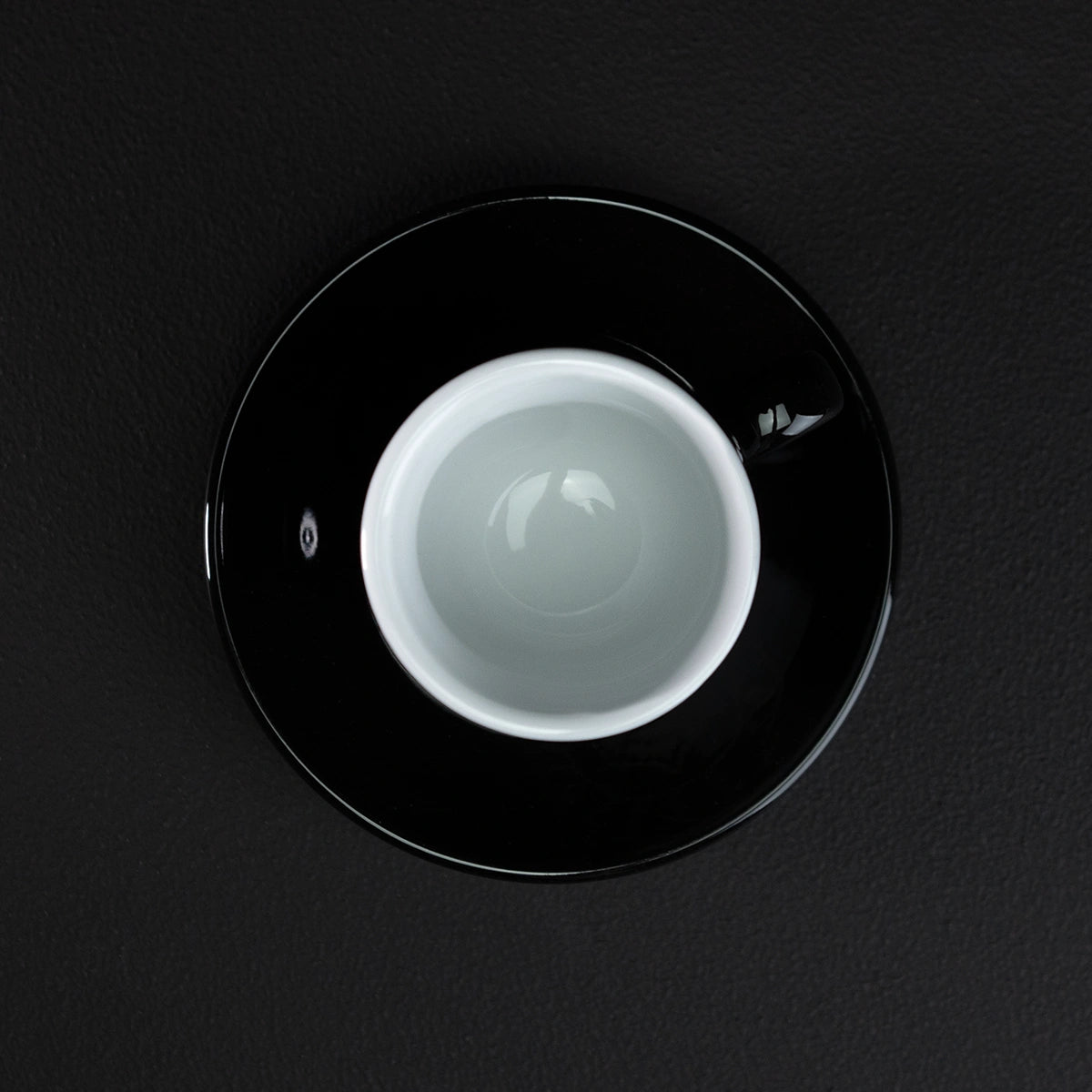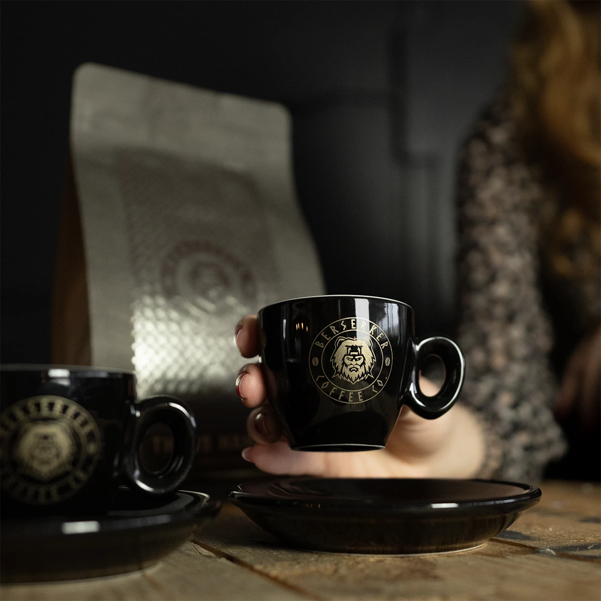 Werde Teil feinster Aromen mit unserem Set aus zwei Espresso-Tassen samt Untertellern, mühevoll gefertigt für diejenigen, die nach unvergleichlicher Stärke suchen. Schwarz wie die Nacht, tragen sie stolz unser goldenes Emblem – ein Symbol für die Siege, die du mit jedem Schluck erringen wirst.